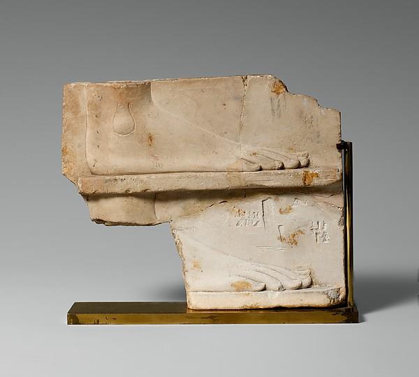 在这个例子的一侧是两个右脚在基线上。另一边是一个王室式的人物,完全在脖子处结束;他手里拿着一个脚链和一根缩写的权杖。简短的墨水指示两边都有通俗的铭文,有脚的一侧有墨水和雕刻的象形文字。