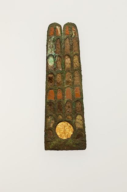 这顶双羽毛冠属于一个大型阿蒙小雕像,或者属于一个与阿蒙关系密切的儿童神。这座雕像可能是用木头制成的,但会加入像这个皇冠这样的铜合金元素,这是一种高声望、大型和昂贵的邪教图像的常用技术。由于这种类型的混合媒体结构是常用的,因此诸如此类的作品,即使在碎片化状态下,也为由有机材料制成的大型寺庙雕像的外观提供了极好的线索,其中大部分现在已经退化和丢失。这件作品还展示了埃及青铜工人令人惊叹的工艺和能力,并带有多色镶嵌物和镀金太阳盘。尽管镶嵌物随着时间的推移而变质,但这件作品的颜色和材料的原始组合会令人惊叹,总体而言,它展示了工匠可以使用铜合金和其他材料制作视觉上引人注目和动态作品的多种方式。
