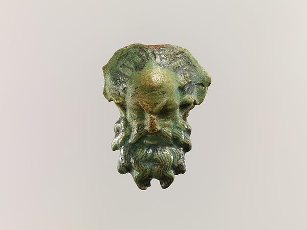 Satyr masks like this one were affixed to the inside rim of elaborate wine jugs (oinochoai) where the handle reached the rim. At the lower end of the handle on the body of the vessel were affixed heads of Silens, the old drinking man who accompanied Dionysus. The authoritative study on Ptolemaic oinochoai notes that the two made an effective pair: the Satyr's eager face invites drinking, and the Silen's benevolent appearance suggested the satisfaction of having drunk.