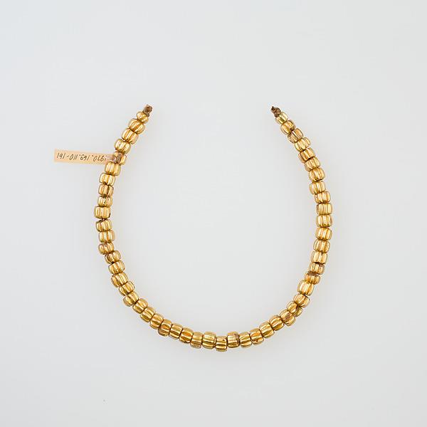 Gold glass beads were a Hellenistic development. They were, created by combining drawn tubes of colorless glass with gold foil. The earliest examples were finished bead by bead. These are all modern stringings; most ancient stringing patterns are lost as the string decays.