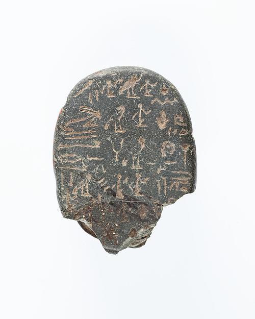 Found with later intrusive burials in a Middle Kingdom tomb, this heart scarab was crudely inscribed with a portion of Spell 30 from the Book of the Dead, asking the heart not to bear witness against the deceased during the judgement before the god of the dead, Osiris. The lower part of the scarab is broken away so the name of the owner is missing. The scarab was pierced for stringing.