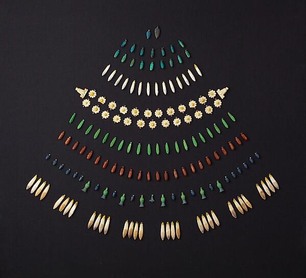 Displayed with similar beads (see 30.8.288, 45.4.13-related), this group of elements from one or more ancient broad collars consists of 26 small white flower petals (12 of which are not shown here), 20 small green leaves, 18 small, and 2 large bunches of grapes.
