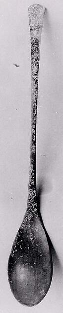 Bronze utensils are common burial objects. While they are similar in form, with narrow, pointed bowls and curved handles, the utensils on view here (22.141.20, .21, .22) were beaten from flat metal and not produced from molds, thus each is unique. Some of the spoons have a rounder, smaller bowl while others have been embellished with swallow-tail ends and incised designs.