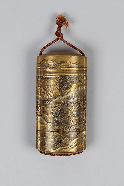 案例(Inrō),带有蜿蜒河流旁盛开的樱桃树的设计(正面);秋天的枫树(反面)