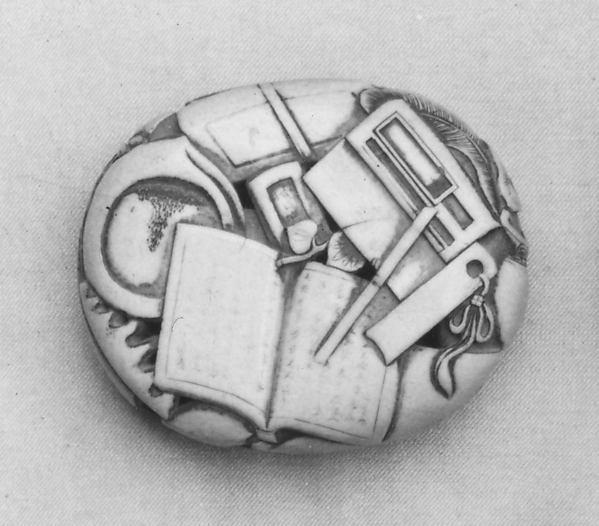 Writing utensils, such as ink stones, brushes, and open books were depicted in Japanese lacquer and textile art and also became favored netsuke subjects.