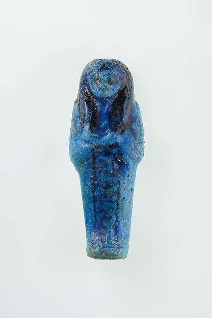)。根据这个时代的其他组合,Nauny最初可能总共有365名工人,一年中的每一天都有一个。 这个木乃伊形状的人物每只手都拿着一把锄头,背上背着一个篮子。 身体正面的铭文称Nauny为"发光的奥西里斯"。这表明她已经通过木乃伊化的过程被转化,并被死者的主神认同,然后在每天晚上穿越冥界时被太阳神的光芒复活。Nauny的Shabtis被分成七个盒子。其中五件及其破折号被送给了大都会博物馆,而两件则被送往开罗的埃及博物馆。