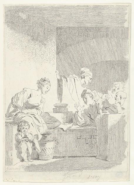 This print is one of a group of four the arist made in 1778, as he was introducing his sister-in-law, Marguerite Gérard to the rudiments of the technique. It features the full array of country "types" that recur in Fragonard’s work: barefoot children, buxom young women, and bearded old men. Because no clear narrative links the figures, the print has traditionally been referred to by the vague title Interior. Gérard made her own etching after the same lost model, presumably a brown wash drawing by her brother-in-law.