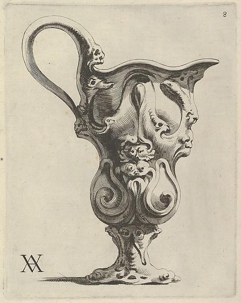 Plate 8 with a design for a ewer, facing right and characterized by numerous masks. From the first part of a series of 48 plates with designs in the Auricular style, predominantly after Adam van Vianen although some might be designs by his son Christaen. The designs were etched by Theodoor van Kessel and published in Amsterdam by Christaen van Vianen around 1646-1652.