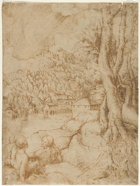 Two Seated Figures in a Landscape with Mountains and a Town (recto); Sketch of a Landscape with Mountains and Buildings (verso)