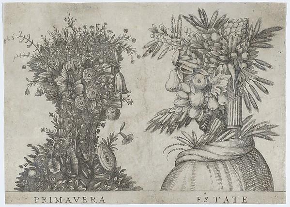 Spring and Summer: two heads made from flora typical of those seasons