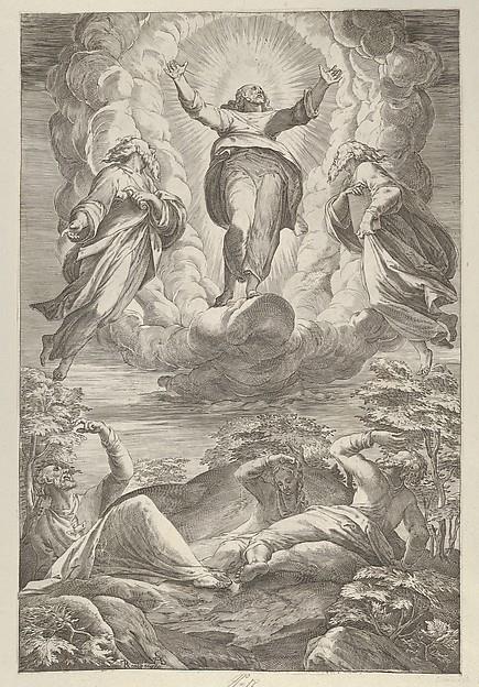 The Transfiguration with Christ flanked by two saints and with the Apostles below