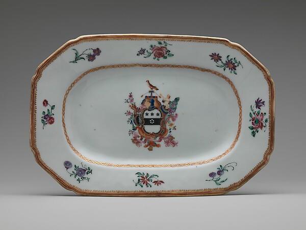 This object belongs to a large dinner service (10.149.1–.248) bearing the Townley family coat-of-arms. The service, probably ordered by Justice Samuel Chase (1741–1811) of Annapolis, Maryland, displays the enamel-painted arms of Margaret Townley, Chase's aunt.