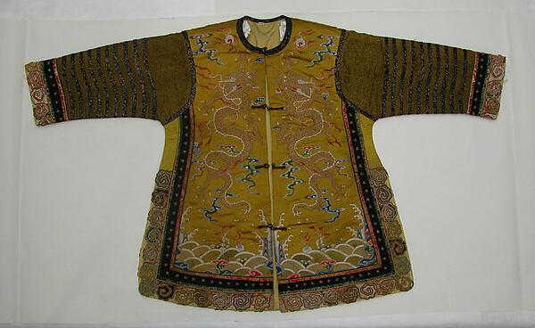 This type of jacket was usually worn by a performer playing a Manchu general. The ceremonial armor worn during parades and inspections inspired its form.