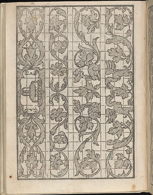 Design composed of 3 vertical columns; each column is printed upon a grid. Left column is decorated in the center with an interlace motif formed by coiling vines at its sides. Middle column is decorated in the center with a flower that is flanked on both sides by a composite creature with a lion head, bird wings, and female human chest that forms part of the stem that coils outward at the sides and terminates with another composite creature. Right column is decorated with 2 curving vines, partially formed by a dragon, which attach to a ram's head in the center.