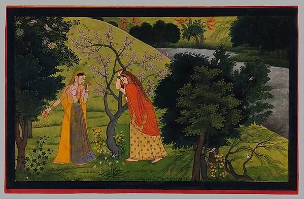 这幅画描绘了12世纪诗人贾亚德娃创作的文学杰作《牛郎之歌》中的一个场景。这幅画描绘了Radha和她的sakhi(朋友)在田园诗般的丘陵环境中,Braj的神圣景观(克里希纳传说的背景),背景是一条流动的河流,周围是开花的树木。