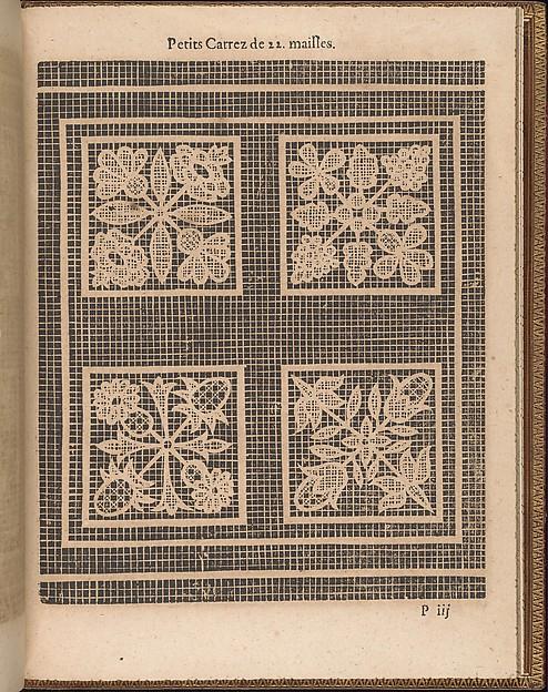 设计印在网格上,用4个正方形装饰,每个正方形都装饰着不同的4瓣花图案,这些图案都进一步框在一个更大的正方形内。