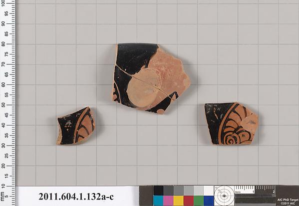 Exterior, part of circumscribed palmette, handle root, and two fronds of a palmette; two fragments with parts of circumscribed palmettes