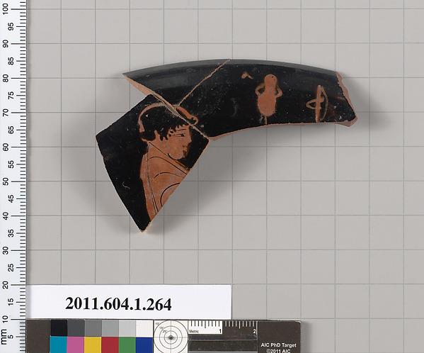 Exterior, youth with himation, sandals in field; to the left of the frontal sandal is a lambda