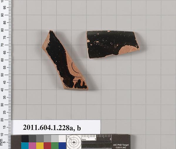 Interior, draped figure sitting on rock?; black glaze rim fragment