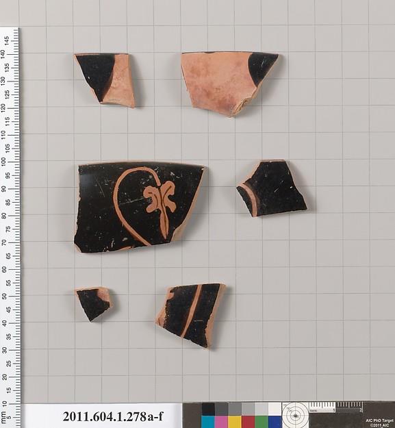 Exterior, two rim fragments with reserve, one fragment with volute and tendril, two fragments with tendrils, one black glaze fragment