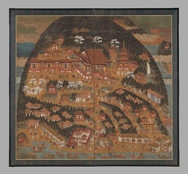 This painting captures the activities of a spring day at Chōmeiji Temple, situated on a hill overlooking Lake Biwa, just east of Kyoto. A wealth of details relates the activities of the temple monks and visitors, who visited the temple to make offerings to the central object of worship, an eleven-headed Kannon, the bodhisattva of compassion. Pilgrimage mandalas (sankei mandara) like this one relate the miraculous stories and seasonal activities of famous temples or shrines. Itinerant preachers used them in a form of storytelling known as etoki, or “picture-narration.” This example was no doubt employed to help raise funds for the rebuilding of the Chōmeiji Temple complex after it was razed by fire in 1516.