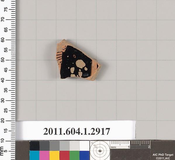 Interior, part of sleeve of garment?; one letter of an inscription, O