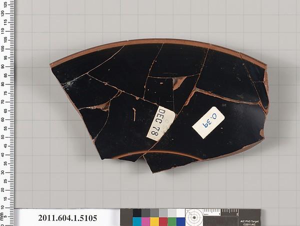 Interior, line border of tondo; Exterior, wreathed satyr moving to left, with right arm bent at elbow, and hand holding a skyphos; wreathed satyr moving to left, with extended right arm and hand holding a skyphos, and his left hand above his genitals; near the head and left shoulder of the satyr on the right, two letters of an inscription, AI