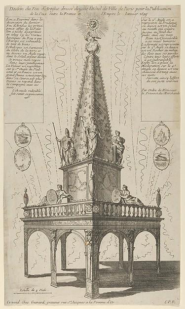 The Treaty of Ryswick was signed on September 20, 1697 ending the War of the League of Augsburg which pitted France against England, Spain and the Holy Roman Empire. The fireworks celebration depicted here took place in January of 1698.