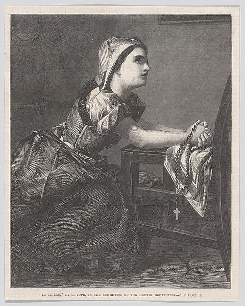 A French servant or country girl here uses a simple chair to practise her faith. Gustav Pope worked in a variety of styles and was influenced by the second wave of Pre-Raphaelitism. He depicted literary and mythological themes, portraits, landscapes and idealized young women. "La Prière" was shown at the British Institution in 1867 (no. 367), then engraved for the "Illustrated London News" by William Luson Thomas. Founded in 1842 as the world’s first weekly news magazine, this periodical regularly published examples of contemporary art.