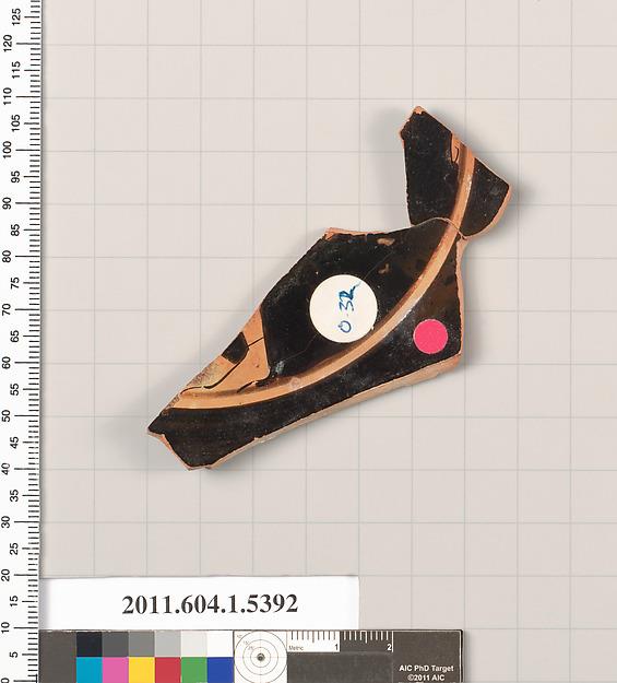 Interior, greaved calf and foot of warrior; two letters of an inscription, LS?