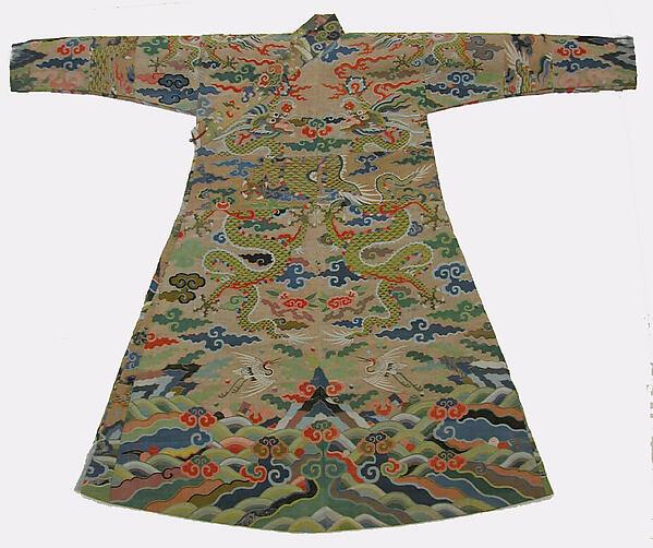 In addition to bolts of cloth, court robes were often sent from China to Tibet in the eighteenth and nineteenth centuries where they were refitted into a style of dress worn by lay aristocrats. Close examination of the dragons on the upper part of this robe reveals that parts of their bodies do not match precisely, which suggests that this garment was either made from a larger one or pieced together from different robes. Such reworking illustrates the value awarded to Chinese textiles in Tibet at the time.