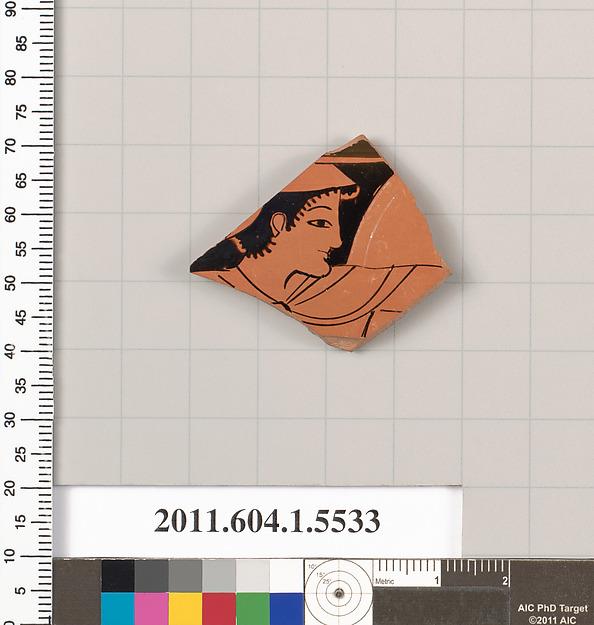 Exterior, head, neck, shoulders, and part of extended left arm, with round shield, of helmeted warrior wearing a chlamys