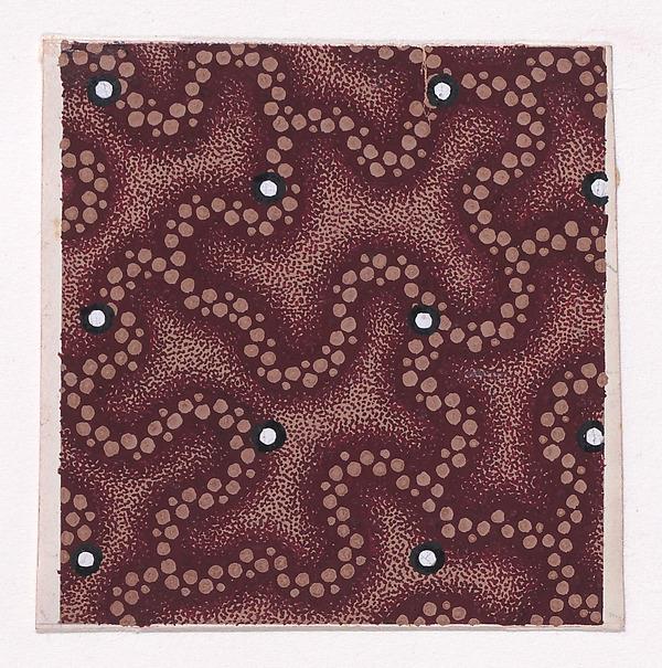 Rectangular sheet of paper with a textile design from a group, dated 1840, made in Mulhouse, Alsace, which was an important nineteenth-century center for textile production in the Haut-Rhin region of France. The design is made up of a vermicular pattern formed with dotted lines of light tan color and outlined with dark reddish-brown stipples over a light tan ground with dark reddish-brown stipples, and alternating vertical and horizontal rows of pearls of white color with black outlines.