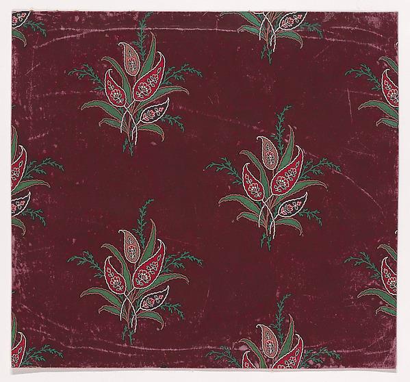 一张长方形的纸,上面有一个团体的纺织品设计,日期为1840年,制造于阿尔萨斯州的莫尔豪斯,该地是法国上莱茵地区19世纪重要的纺织品生产中心。该设计由六片风格化的大叶子和四根风格化的树枝组成,叶子涂有绿色,四个佩斯利图案装饰着红、黑、白三色的玫瑰花结和风格化的叶子,在酒红色的地面上交替垂直排列。佩斯利图案是彩色的:两个是红色的,一个是浅棕褐色的,还有一个是黑色的。