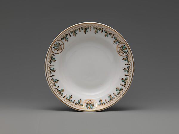 联合瓷器厂是19世纪下半叶美国最重要、最有创造力的瓷器制造商之一。除了由德国出生的艺术总监Karl H.L.Müller设计的富有想象力的作品外,该公司的支柱是生产重型瓷器酒店餐具。这项广泛的服务是由联合瓷器厂负责人托马斯·卡尔·史密斯作为礼物送给他的女儿福雷斯特·史密斯·查斯牧师的。镀金喇叭花和篮子图案的新古典主义装饰与绿松石珐琅相得益彰。与该公司为1876年费城百年博览会上的展览而设计的更古怪、更奢华的设计不同,这些陶器的晚餐服务更偏向于克制的古典风格。这项服务是Chace家族的后裔。
