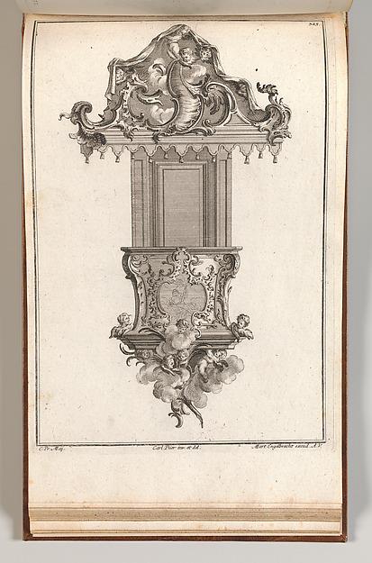 正面图显示了悬挂式讲坛设计的装饰印花。讲坛的特点是用罗凯勒装饰的华盖,上面覆盖着由5个小天使托起的窗帘。这幅版画装订在一张专辑中,共有27个系列,共122幅装饰版画,由著名的奥格斯堡出版商马丁·恩格尔布雷奇特资助。