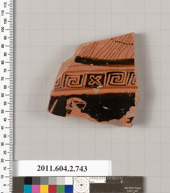 Part of a two row calyx-krater; on the top, drapery and foot of woman to right; ground line comprised of meander and saltire square; below, head, neck, shoulder, and extended arm of a draped, filleted satyr looking to left