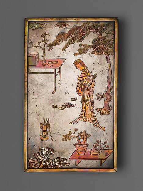 An example of late seventeenth-century Chinese pewter work, this screen is distinguished by the use of two-tone pictorial decoration. On the front, a woman plays the game touhu, in which arrows are shot into a narrow-necked vase. On the back of the screen is a quote from a Tang-dynasty poem by Shen Quanqi (ca. 650–729).