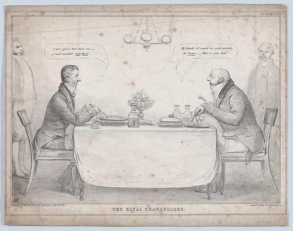 在这部政治讽刺剧中,布鲁厄姆勋爵和格洛斯特公爵隔着餐桌面对面。右边的公爵说:"我的朋友都说我对舌头非常偏袒。"你的菜是什么?"在左边,Brougham说:"我把它放在我面前,一个最优秀的小牛头。布鲁厄姆是英格兰大法官,格洛斯特公爵是剑桥大学的校长。