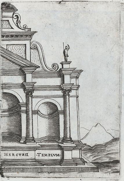该版画是一组建筑版画的一部分,描绘了罗马古代的建筑,从凯旋门到意大利、法国和西班牙的澡堂、寺庙和宫殿。其中一些建筑是根据中世纪的描述进行人工重建的,而另一些则被描绘成毁灭性的状态。已知这些板块有几种(未编目的)状态,并且随着时间的推移发生了微小的变化。一些建筑的名称被更改了,由于板块裂缝和氧化,这些板块被裁剪了