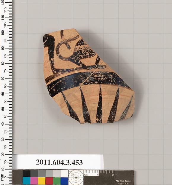 Bent leg of a male to right; foreleg, hindquarters, hind leg, and tail of a sphinx to right; below the figures, a thick band of black glaze; rays