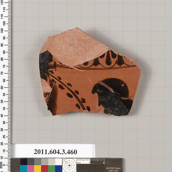 At the top of the panel, palmette-lotus chain; part of a kithara?; ivy; head of a filleted figure to left