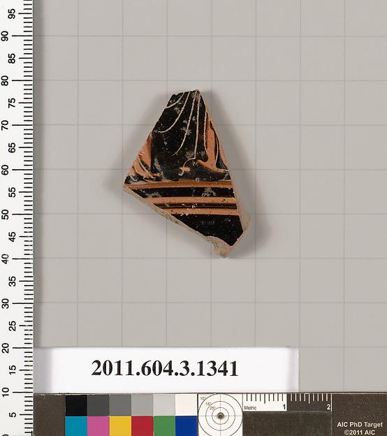 Two animal hooves to right; lower legs and feet of a draped figure to right; animal hoof to right
