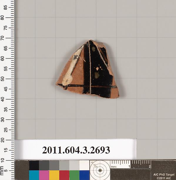 Part of the upper torso and right arm of a draped woman, holding a spear in her right hand?