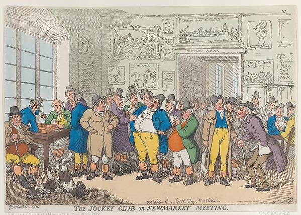 A group of men gathers in a betting room, with two hunting dogs at left.