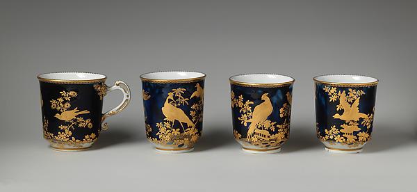 The gilding on these pieces (see 54.163.7a, b–.34) is of a very high order, with tooled work on a thick application of honey gilding selectively matte and burnished for a lively design of pheasants, peacocks, and swallows in a landscape. The deep bowl was for little cakes.