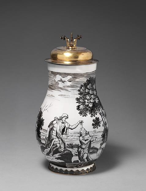 Rössler is recognized as the most important independent decorator of German faience active in Nuremberg. He specialized in schwarzlot, a black and white decoration technique that evoked Rössler’s work as a copper engraver. Along with complex battle scenes, Rössler specialized in biblical images such as this example showing the baptism of Jesus in the Jordan River, which the painter has anachronistically depicted taking place near a German village.