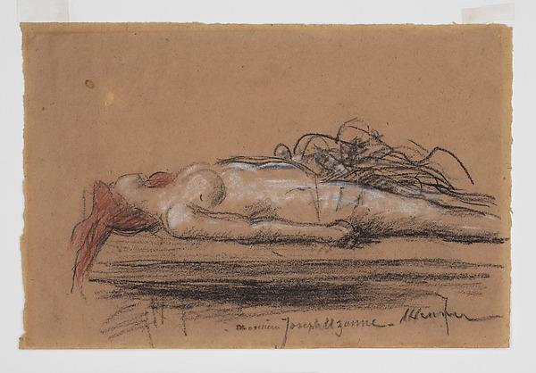 Best known for his paintings of mysterious and sensuous nudes, Henner also treated religious themes with a particular focus on the victims in biblical narratives. This drawing relates to a major work that he first prepared for the Salon of 1895, "Wife of the Levite from Ephraim." Its subject draws upon a prose poem by Jean-Jacques Rousseau (1762) based on the Old Testament (Judges 19–21), in which, to avoid his own rape by a mob, the Levite offered up his concubine instead. This early study focuses on the violated, prone body of the Levite’s sacrificed wife. The final version of the composition, "The Levite of Ephraim and His Dead Wife" (Art Gallery of Hamilton), won Henner a medal of honor when he exhibited at the Salon of 1898, and includes the remorseful figure of the Levite.