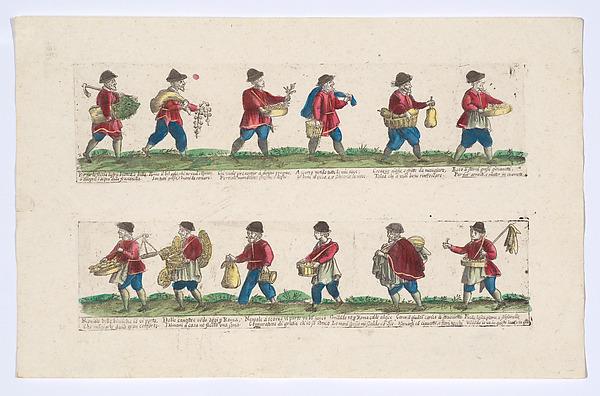 Unnumbered plate depicting the trades of Rome, here including vendors of garlic, ravioli, canisters etc, from the 'Descrición de las artes que se llaman para los calles de la ciudad de Roma'