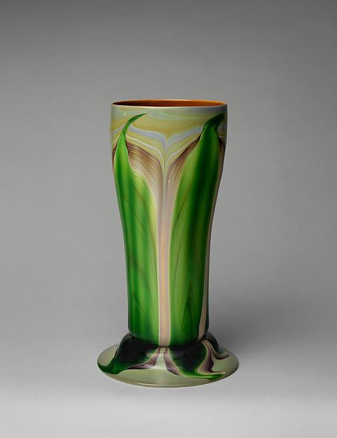 这件物品是路易辛和亨利·奥斯本·哈维迈耶(96.17.9–.56)于1896年赠送给博物馆的40多件藏品中的一件。这是博物馆收藏的第一件美国玻璃。很可能是在Louis Comfort Tiffany的推动下,Havemeyers夫妇在Tiffany开始制作装饰性吹制玻璃器皿仅三年后,就向博物馆展示了他们收藏的Tiffany Favrile玻璃。蒂芙尼花瓶和牌匾的形状、颜色和装饰灵感来自自然世界和古老的玻璃。